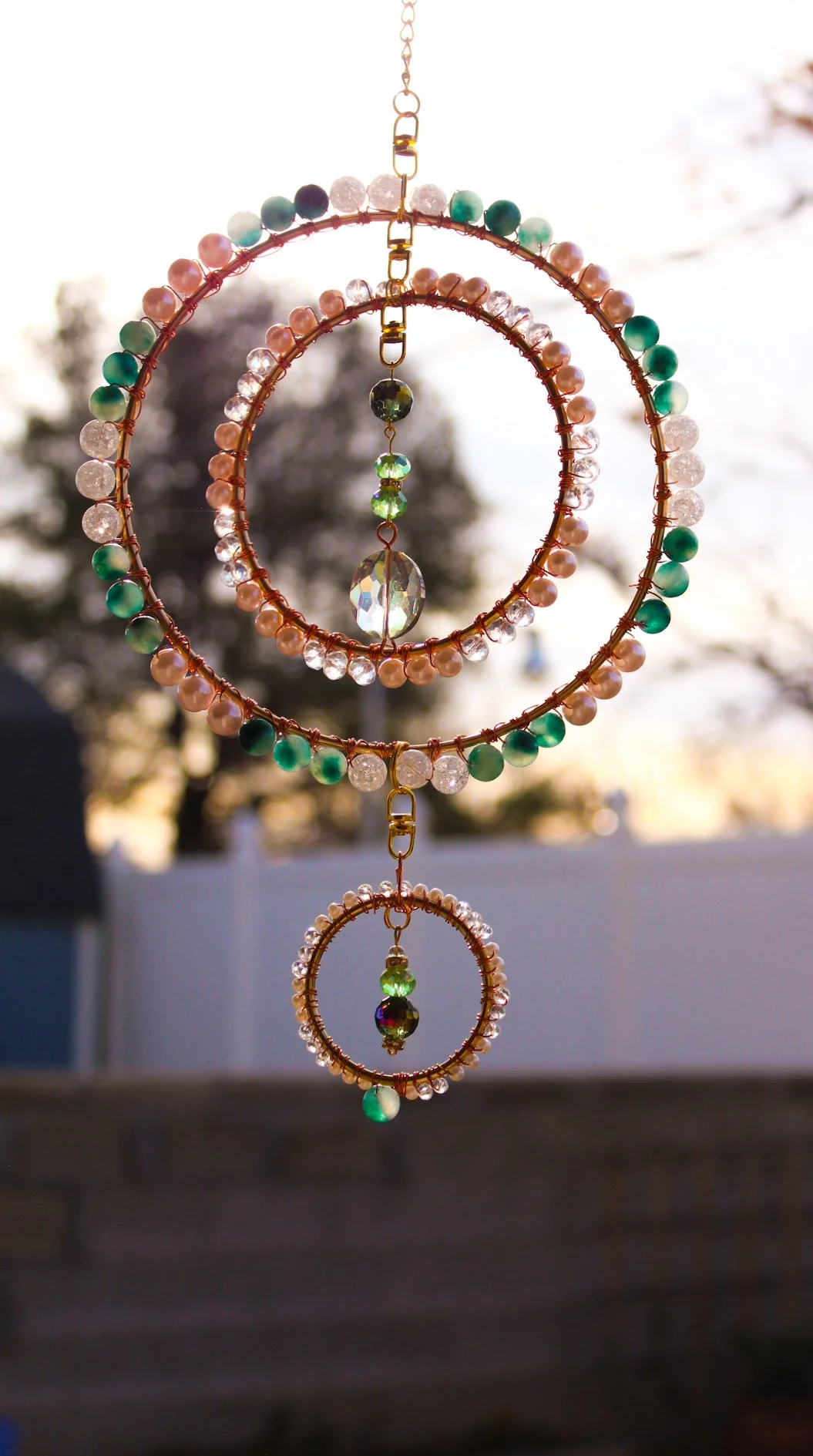 Delicate hand-beaded and hand-wired sun-catchers that catch light and make rainbows. Each piece is crafted with glass beads and quality wire, creating layered shapes and gentle movement. This lightweight and ready to hang piece will dazzle and brighten any home.
